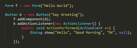 Now lets see some code. For those of you who know Swing or even GWT, for that matter, this code will be immediately understandable. Page components are created and action listeners are attached as anonymous classes. In the example we create a button and add it as a component to the form. Then we add an action listener to the button.When the button is click a dialog box pops up showing the message.