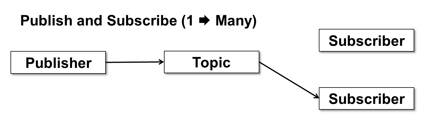 In a publish/subscribe set-up, the origin of the messages is referred to as publisher and the destination is referred to as a topic. Here many subscribers can subscribe to a topic and each subscriber receives an instance of the message. So one message is sent to many waiting subscribers. If a subscriber is down it will not receive the message when it is up and running again.