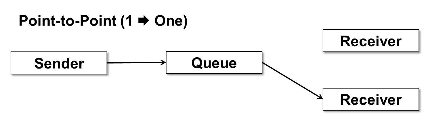 In a point-to-point set-up, the origin of the message is referred to as the sender and the destination is referred to as a queue. Here messages are sent to a single destination and only one instance of the message is received by the receiver. If the receiver is down, messages are held in the queue until the receiver is up and running again.