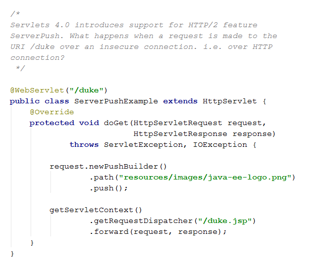 Servlets 4.0 introduces support for HTTP/2 feature ServerPush. What happens when a request is made to the URI /duke over an insecure connection. i.e. over HTTP connection?