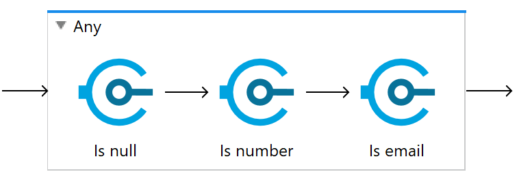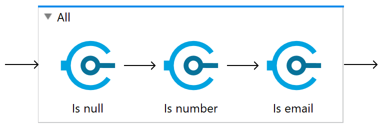 Validators can be collected together in one of two available scopes: ALL or ANY. The manner in which the result of the validator inside the scopes varies.