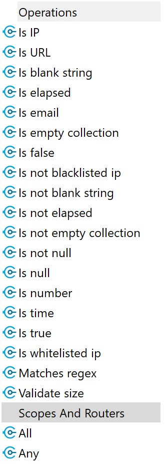 The Mule Validation Module provides a set of 19 fix validators and two scopes. The validators provide a convenient way to test that data conforms to a pattern. For example, the Is Email validator tests if the input string is a valid email address. The two scopes collate validators together and execute them collectively, and depending on whether the scope is ALL or ANY, execution of the flow will continue or an exception will be thrown. See figure 1 for a full list of validators and scopes: