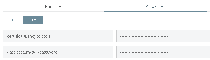 Fig 2: The properties tab in Anypoint Runtime Manager show masked property values